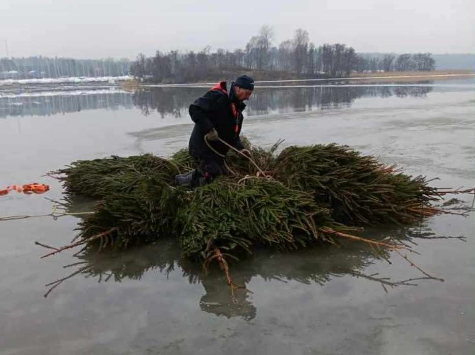 VARMARE KLIMAT. Det optimala är att lägga ut granarna direkt på isen – då sjunker de av sig själva när isen smälter. Bilden är från ett tidigare år, när vintrarna var kallare. Foto: Stefan Lundin