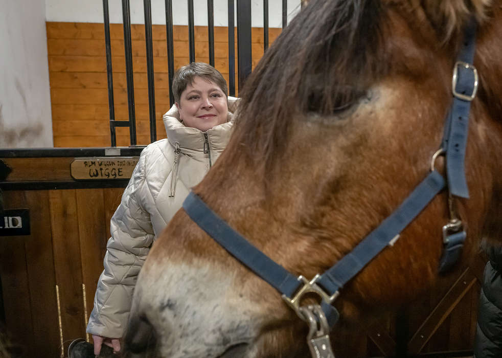 TACKSAM. Olena är en av sjukvårdarna från Ukraina. Hon klappar vant hästarna och berättar om hur viktigt stödet från Sverige är för de som kämpar i kriget. Foto: Roffe Andersson