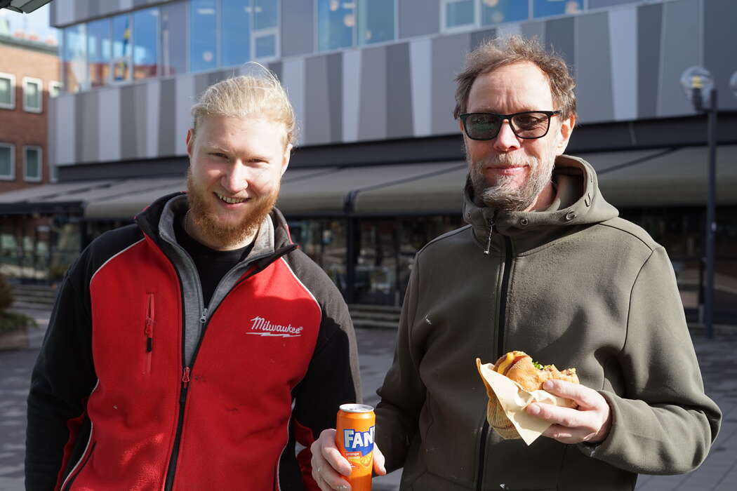 KORVKIOSK. Loke och Jan tar en stålunch på det soliga torget. Foto: Loke Johansson