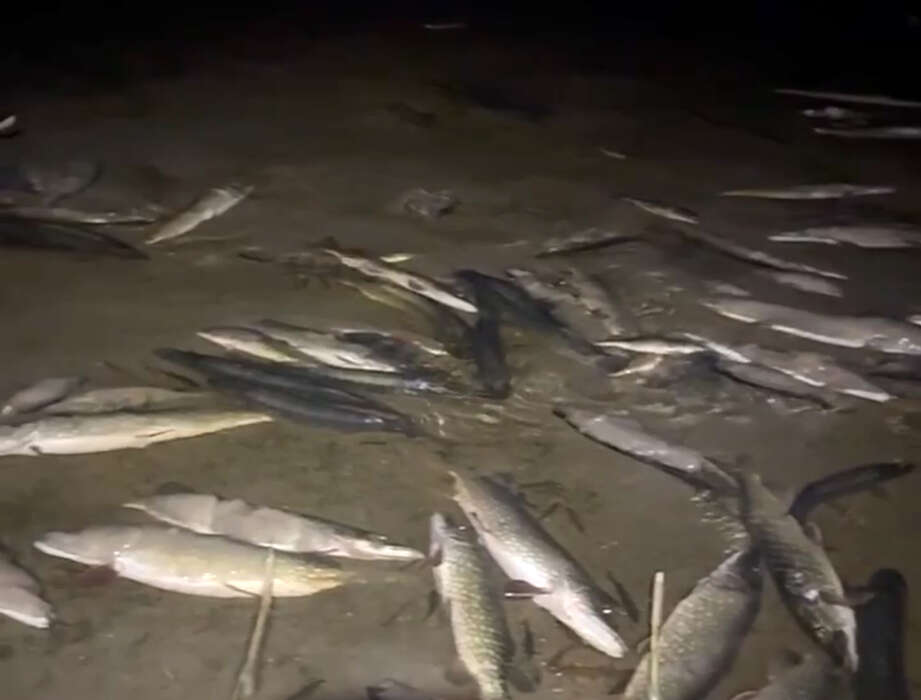 I en mar på Östra Lagnö har hundratals gäddor, abborrar och mörtar dött på grund av det låga vattnet och kalla vädret