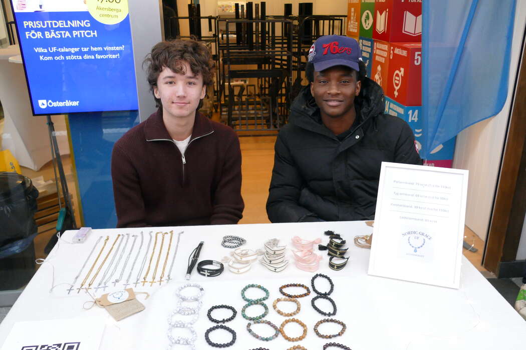 SMYCKAT. Bakom Nordic Grace UF står Hugo och Jeremy. Med i företaget är även Oskar och Vilhelm (ej med på foto). De säljer accessoarer som smycken, vissa med kristet budskap. – Vi har sålt bra. Först trodde vi att det främst skulle vara tjejer som var intresserade men även killar visar intresse, säger Hugo. Foto: Lina Abrahamsson
