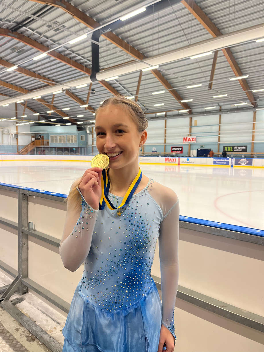 HEMMAPLAN. I november deltog Elin Nyholm Fredriksson i Mastertouren och fick medalj. Fotot är taget i Österåkers ishall. Foto: Privat