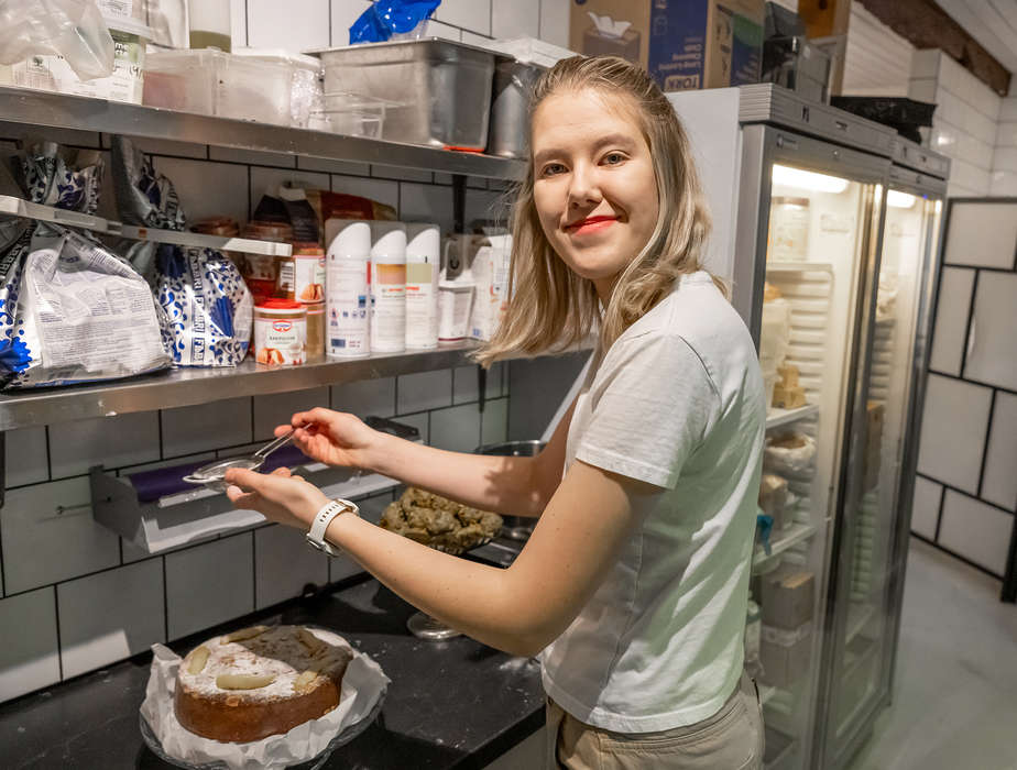 Det var det intresset som gjorde att hon i somras svarade på en annons där Glassverkstan sökte folk som kunde göra gelato. Trots sin unga ålder på 22 år har hon allt eftersom fått ta över ansvaret för all gelato samtidigt som hon bakar till Gårdscaféet och förser restaurang Il Pascolo med desserter. Samtliga tre verksamheter hänger ihop och huserar alla på Stora Säby gård.