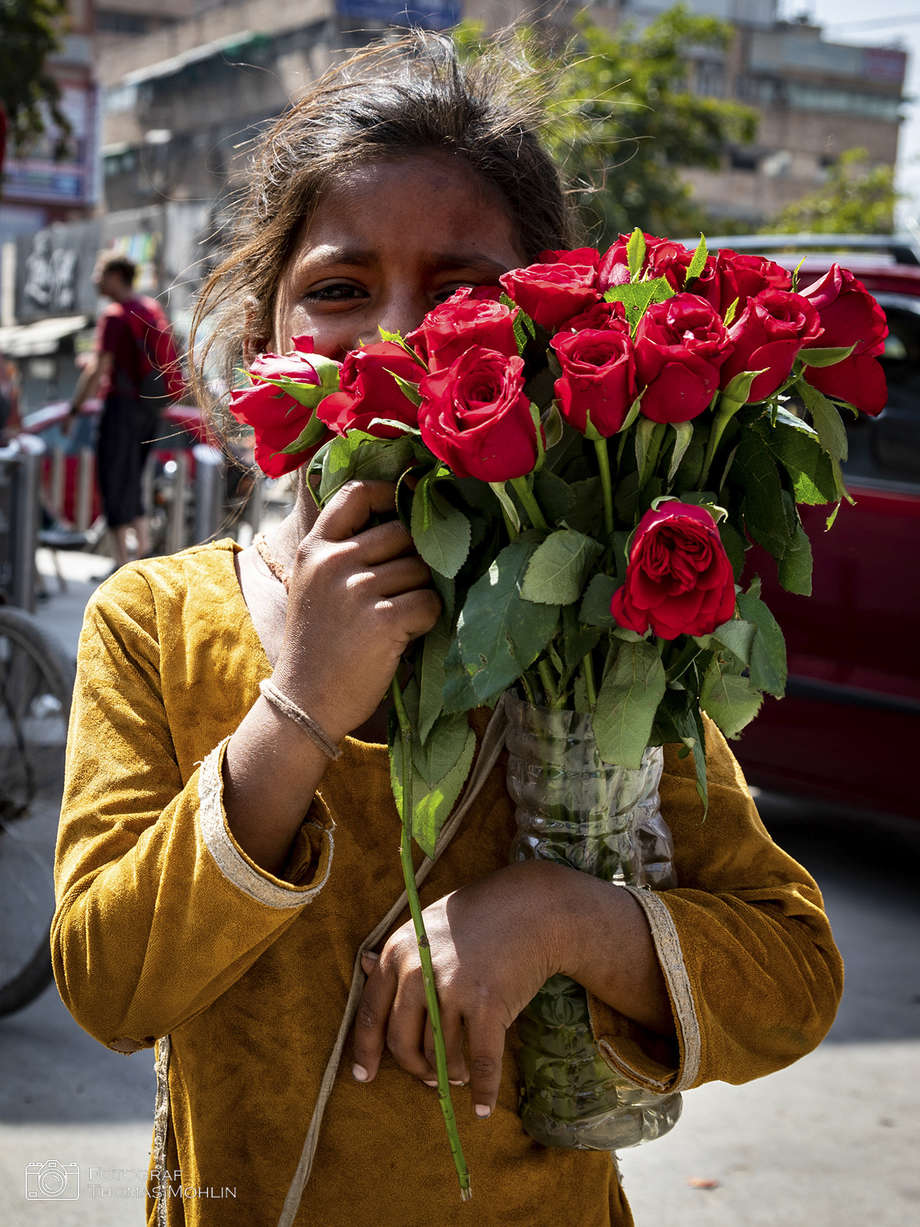 – Jag var i Indien, och då mötte jag en flicka som sålde rosor. Hon hade en väldigt smutsig klänning, det kunde bara anas att den en gång varit gul. Jag frågade om jag fick ta en bild, och trots att hon sa ja gömde hon sig lite bakom buketten med röda blommor. Det kanske inte är en bild man säljer, men den är viktig för mig.