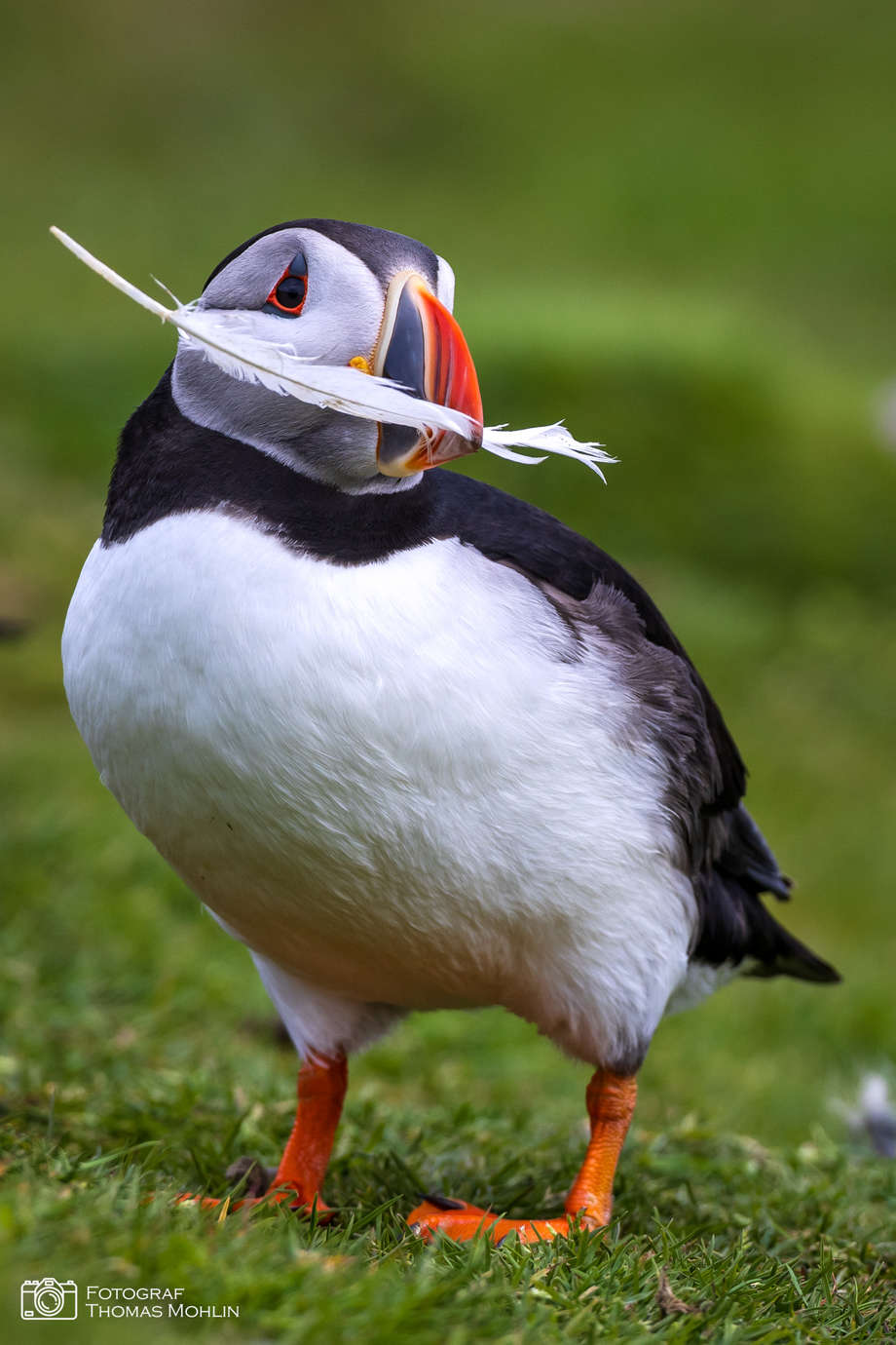 ENVIS. Lunnefågeln på Shetland hittade en fjäder och ville inte släppa taget, berättar Thomas. Foto: Thomas Mohlin
