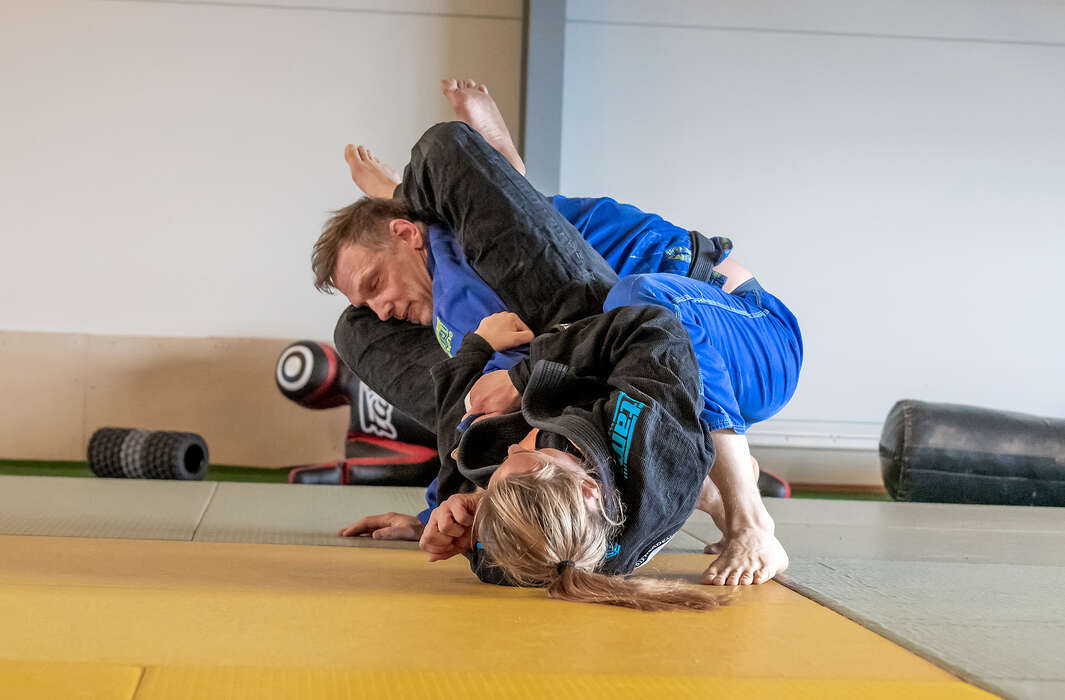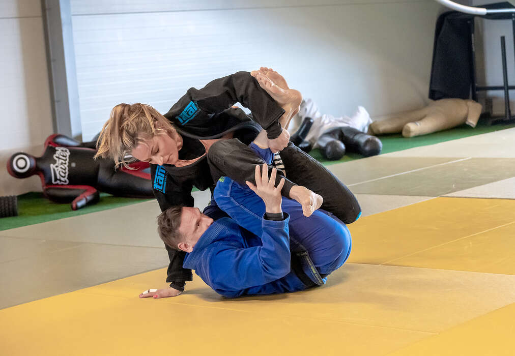Bakom henne springer hennes 9- och 4-åriga söner runt i lokalen tillsammans med Niclas – make och tillika coach. Plötsligt skruvas volymen upp och musik dånar ur högtalarna i Hilti BJJ:s träningslokal. Livspusslet hon pratar om blir påtagligt.
