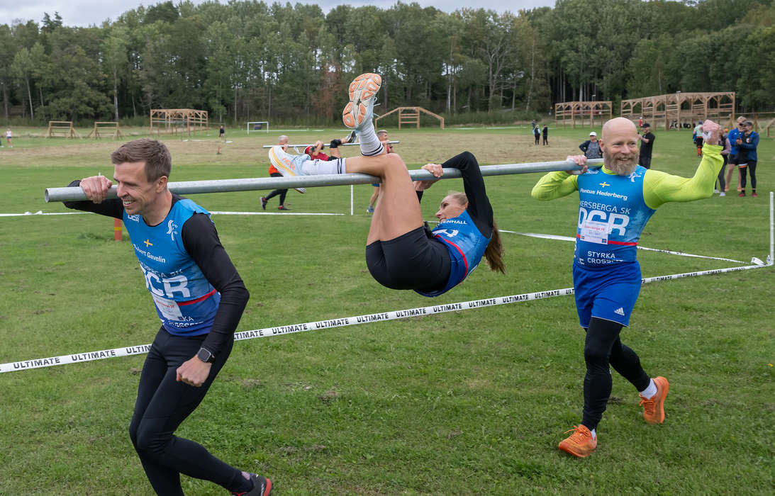 STYRKA. OCR-sporten bjuder på allt möjligt. Ett delmoment för Robert Gavelin och Pontus Hederberg var att bära runt Nenne Slättenhäll. Foto: Roffe Andersson